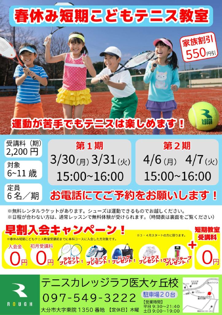 【イベント情報】春休み短期こどもテニス教室 3/30.31(月・火)4/6.7(月・火)開催!!申込受付中!