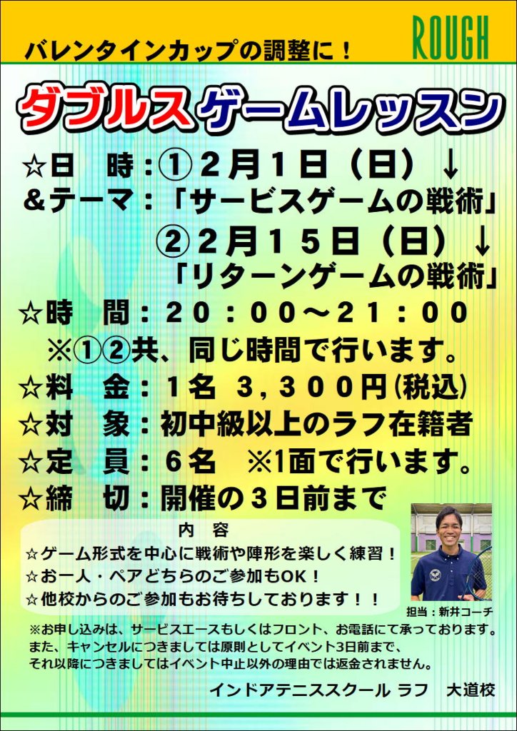 大道校の2月はバレンタインカップに向けてのイベントや、インドアで快適に楽しめるイベント盛りだくさん!