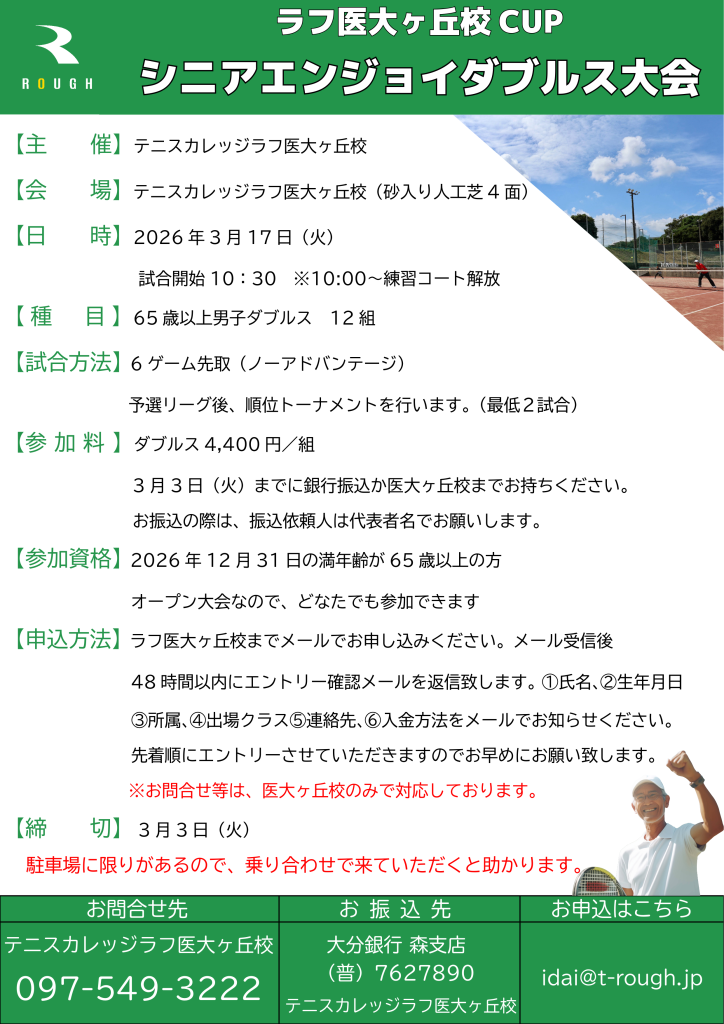 シニアエンジョイテニス大会の締切日を3/10(火)まで延長します!!