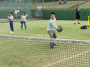 手の平にダンボール等で作ったラケットをはめて打ち合う「テニピン」