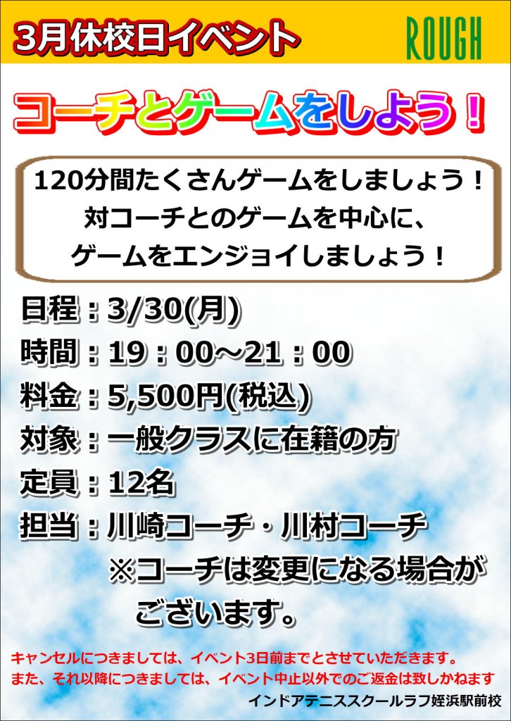 振替レッスンとナイターイベントになります!