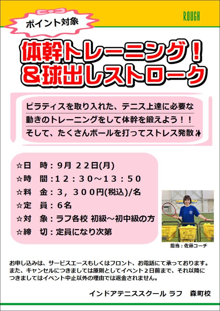 今回のイベントレッスンでは、テニスの捻り動作をスムーズに行うためのトレーニングと、前後左右に振られてもぶれない体幹作りのトレーニングを行います✨