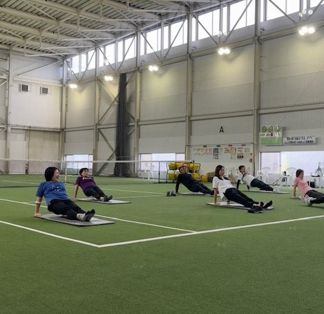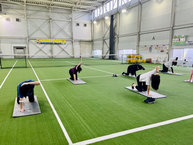 今回は、テニス特有の捻り動作の際にぶれない体幹づくりをテーマに、マットトレーニングをメインに行いました。
