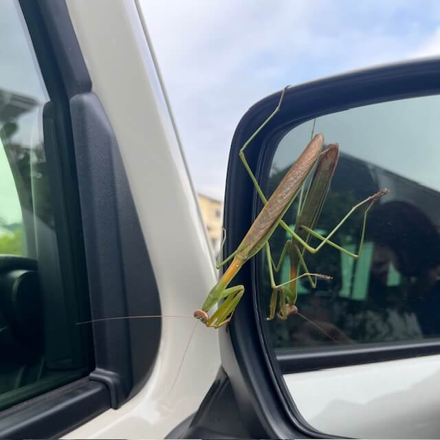 虫が苦手なので、早く飛んでいってくれることを願っていたのですが、、なんとも強いカマキリは風にも負けず、ラフ森町校まで一緒について来ちゃいました💦