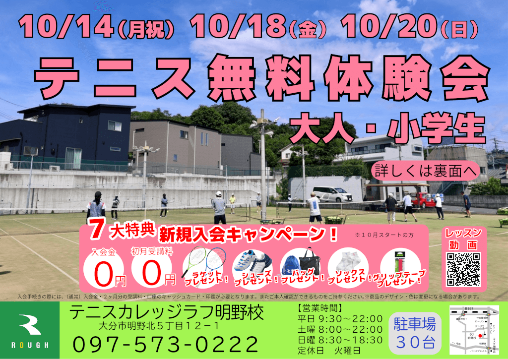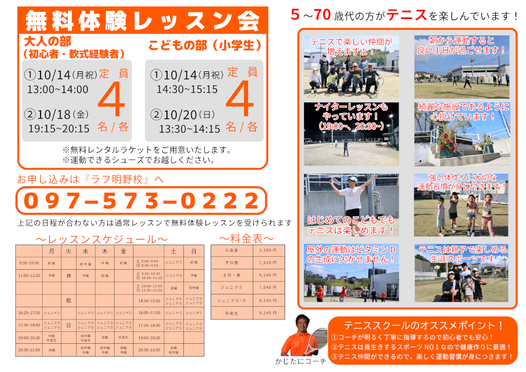 テニスが気になっている方は10月の無料体験レッスン会でテニスを楽しんでください!