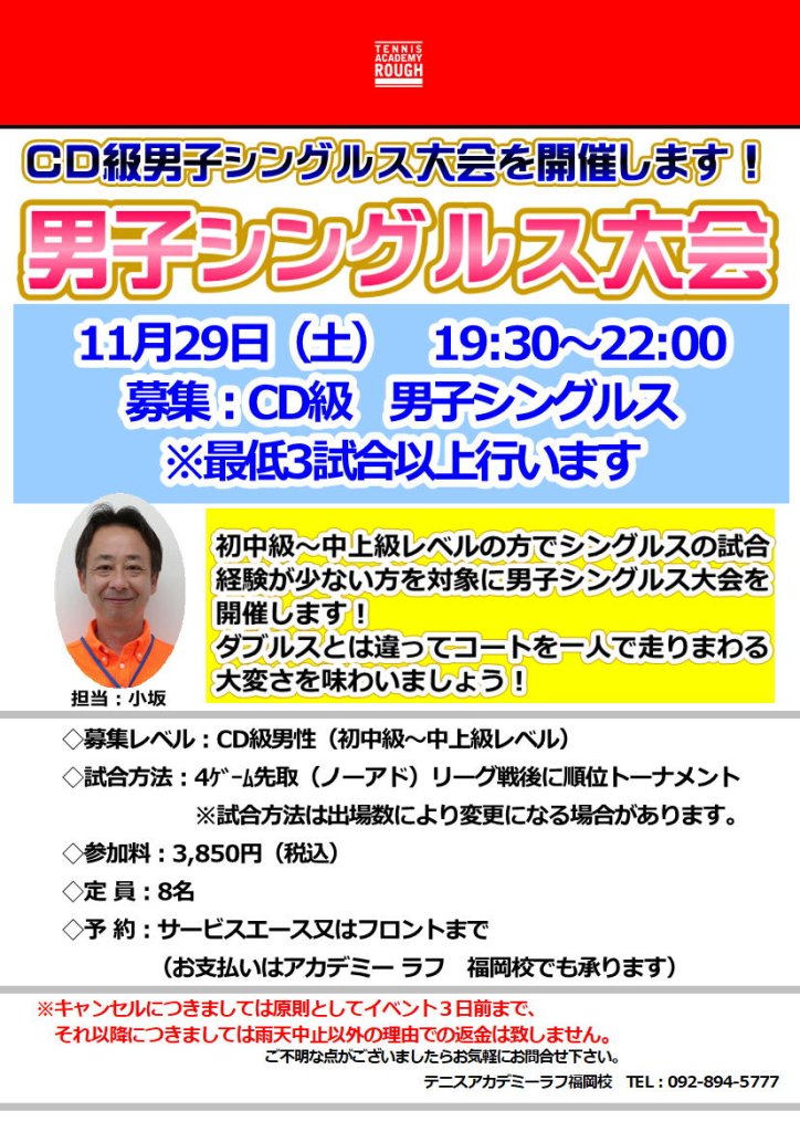 試合経験の少ない初中級~中上級男性が対象のシングルス大会!