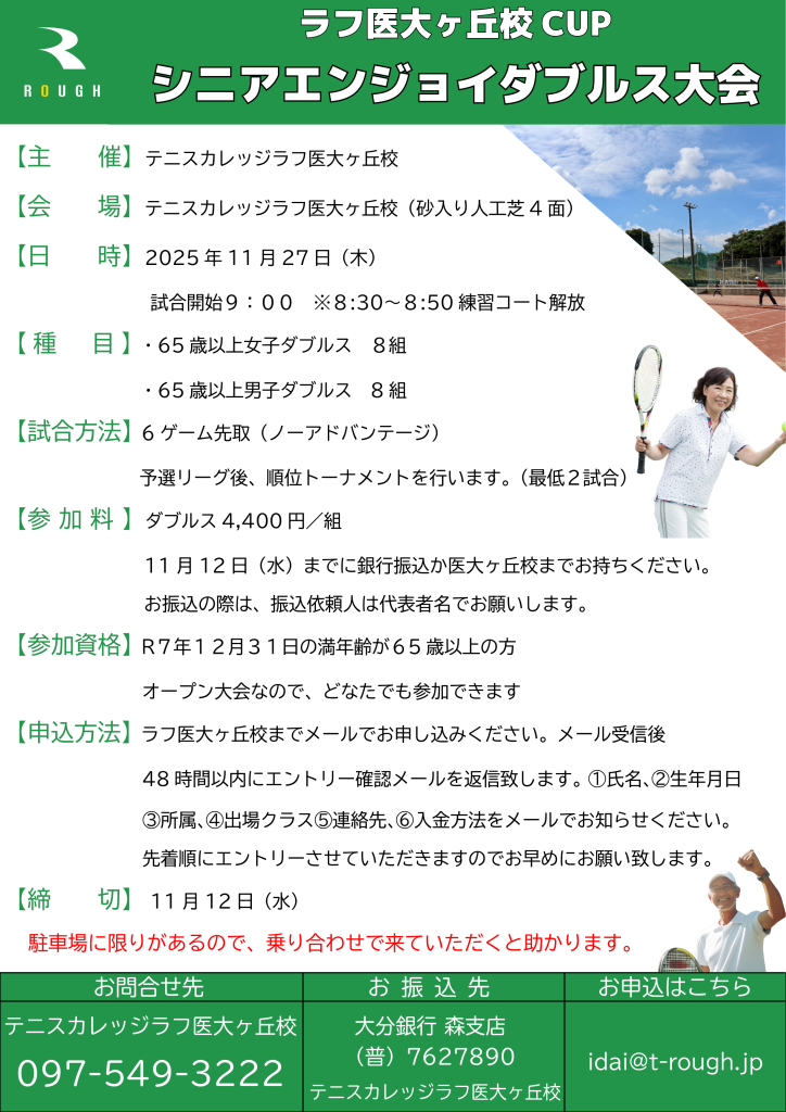 シニアエンジョイテニス大会 男子ダブルス 好評につき募集枠を12枠に拡大!!