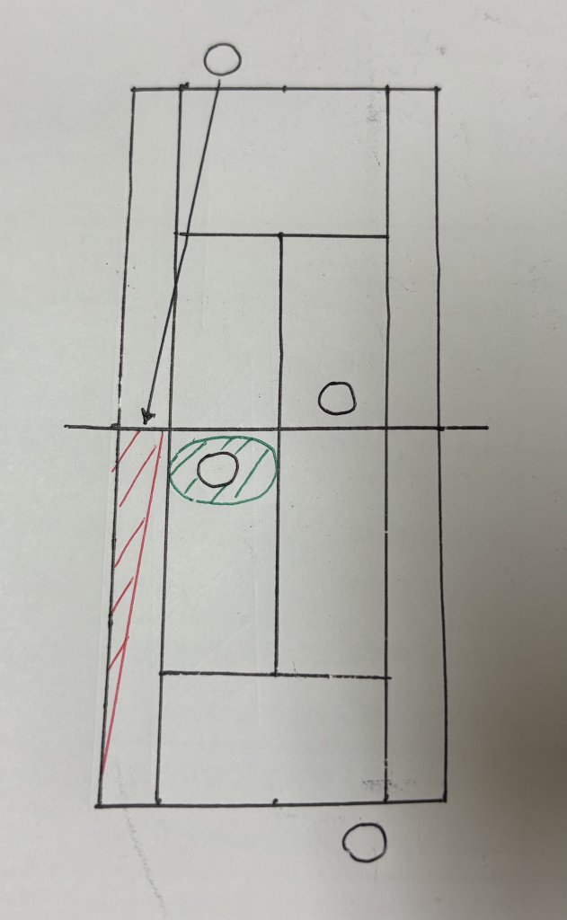図の緑の斜線が前衛の取れる範囲、赤い斜線がそれを躱してストレートを抜くために入れなければいけない範囲です。
