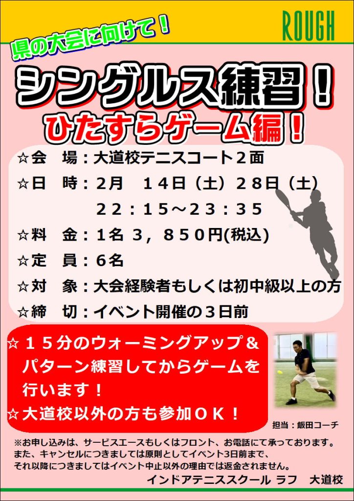 2/14のイベントは終了してしまいましたが、次回のシングルス練習会は2/28(土)22:15からとなっております!