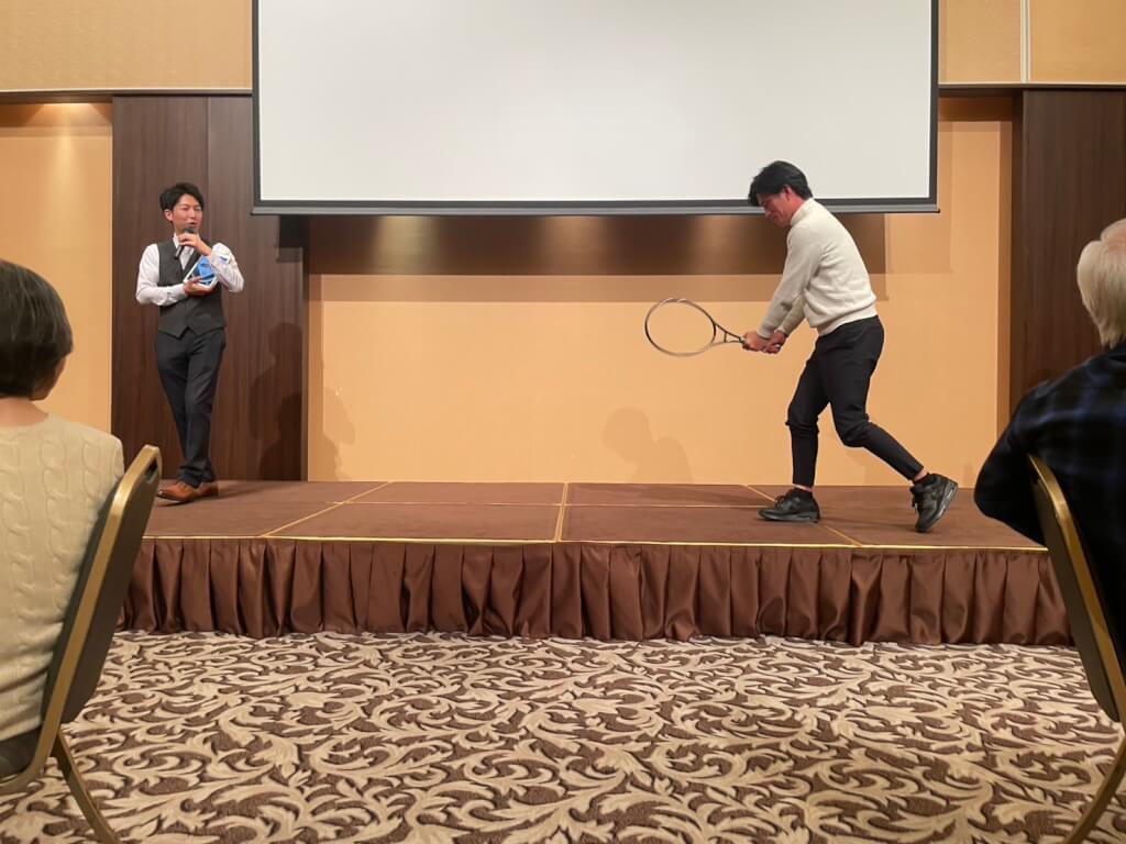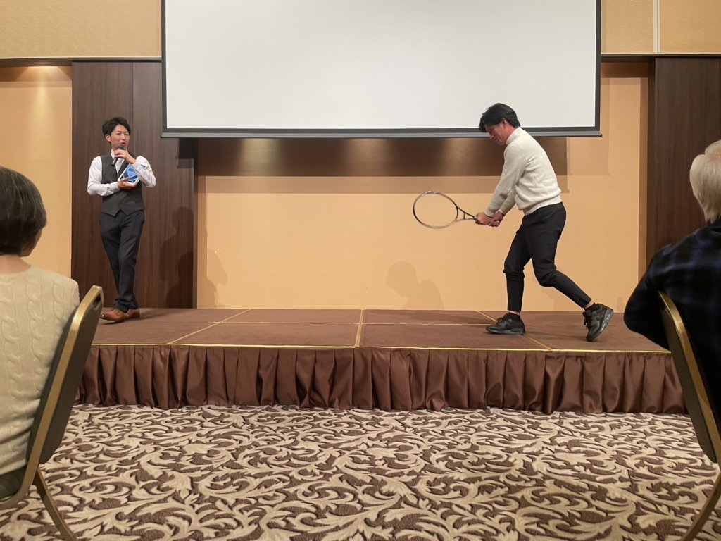 目玉のラケットが当選し喜びの素振りを披露するTさん(おめでとうございます!)